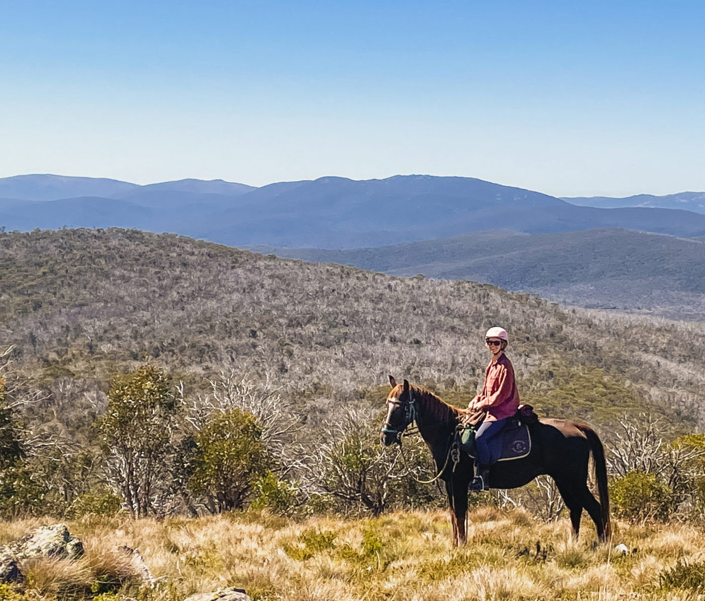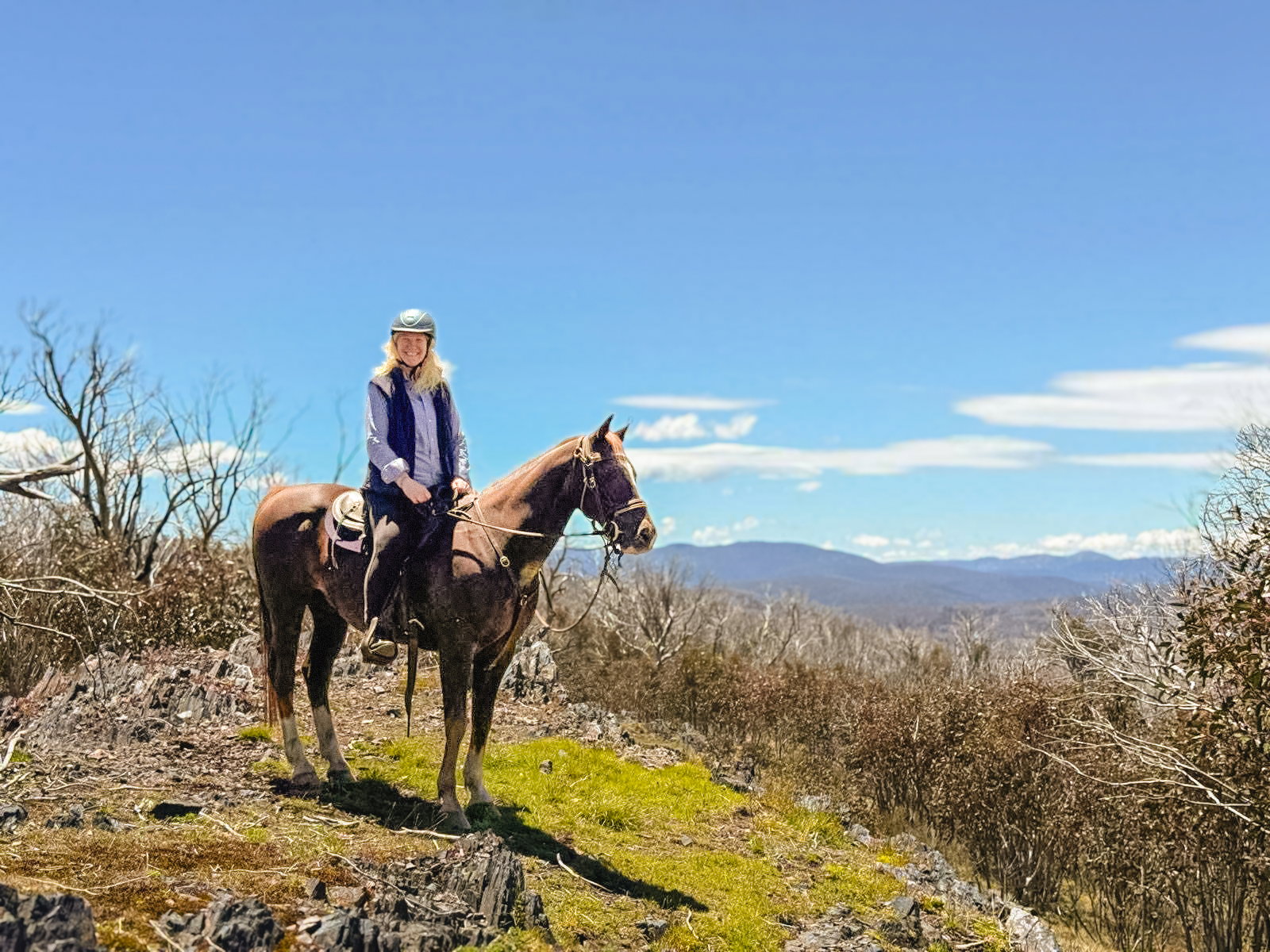 Heading down the mountain towards the aptly named Wild Horse Plain, you’ll dismount for one last saddlebag-packed lunch on the grassy banks of Chance Creek. Finally, you’ll ride home along Alpine Creek Fire Trail, with chances to trot and canter on the way.