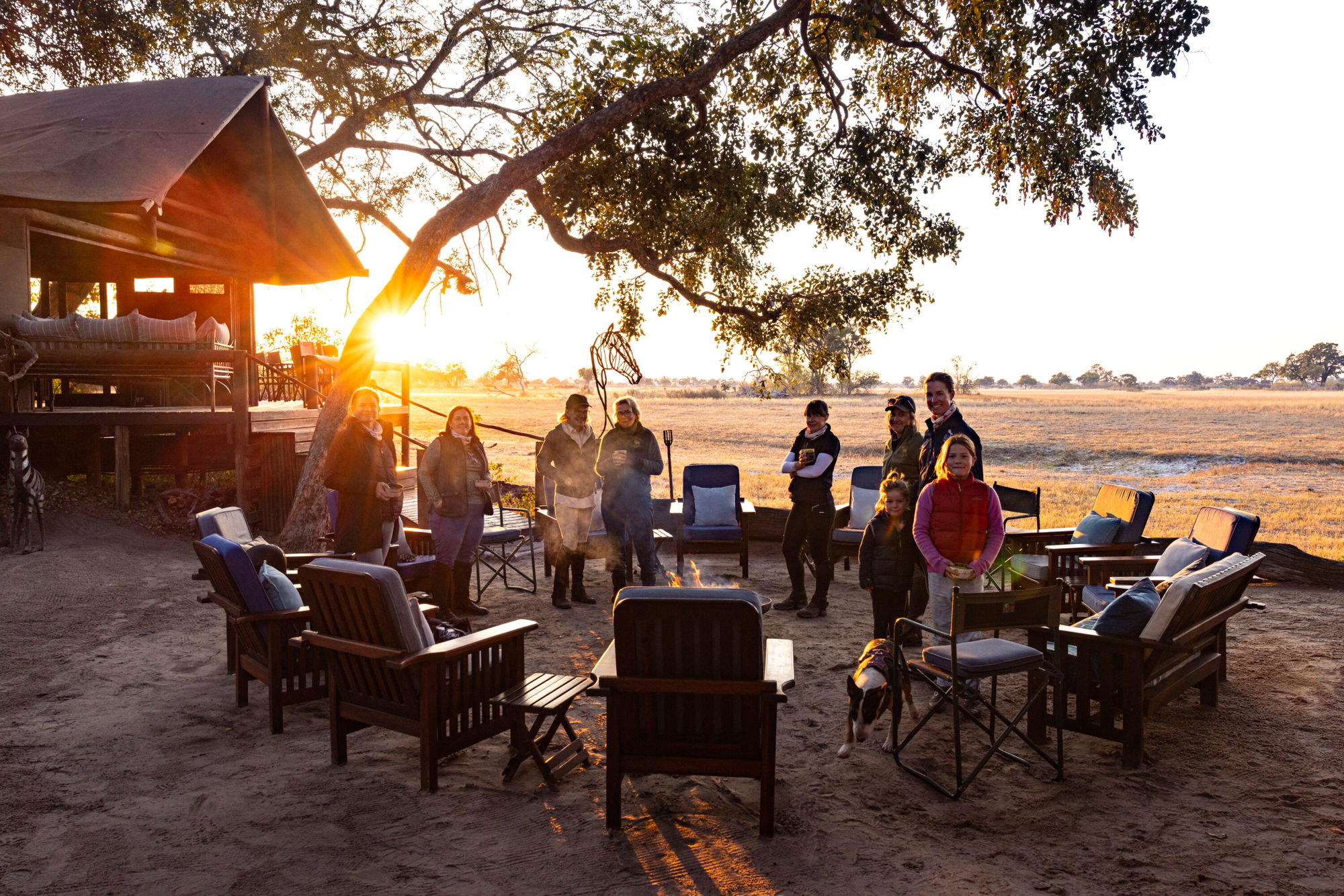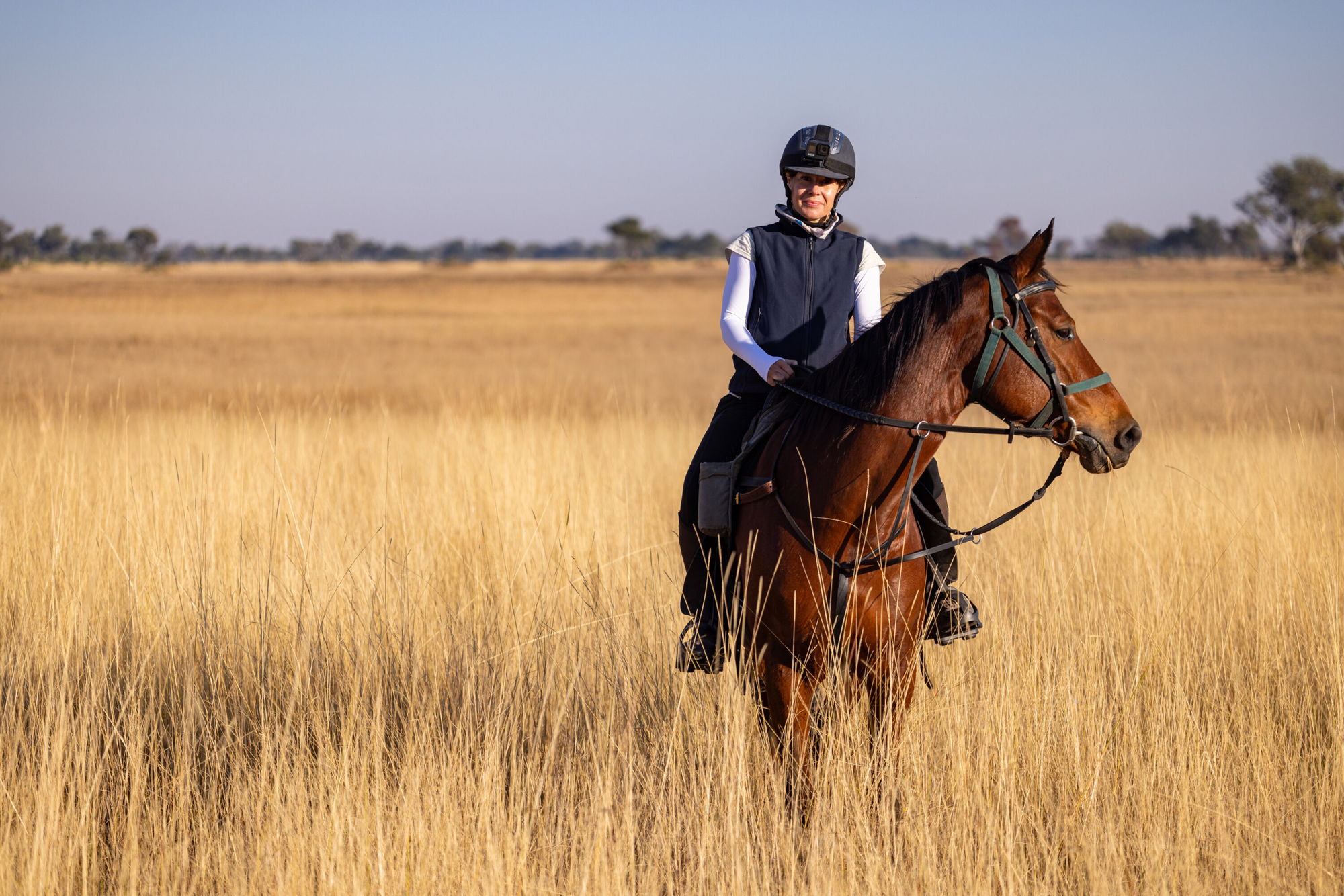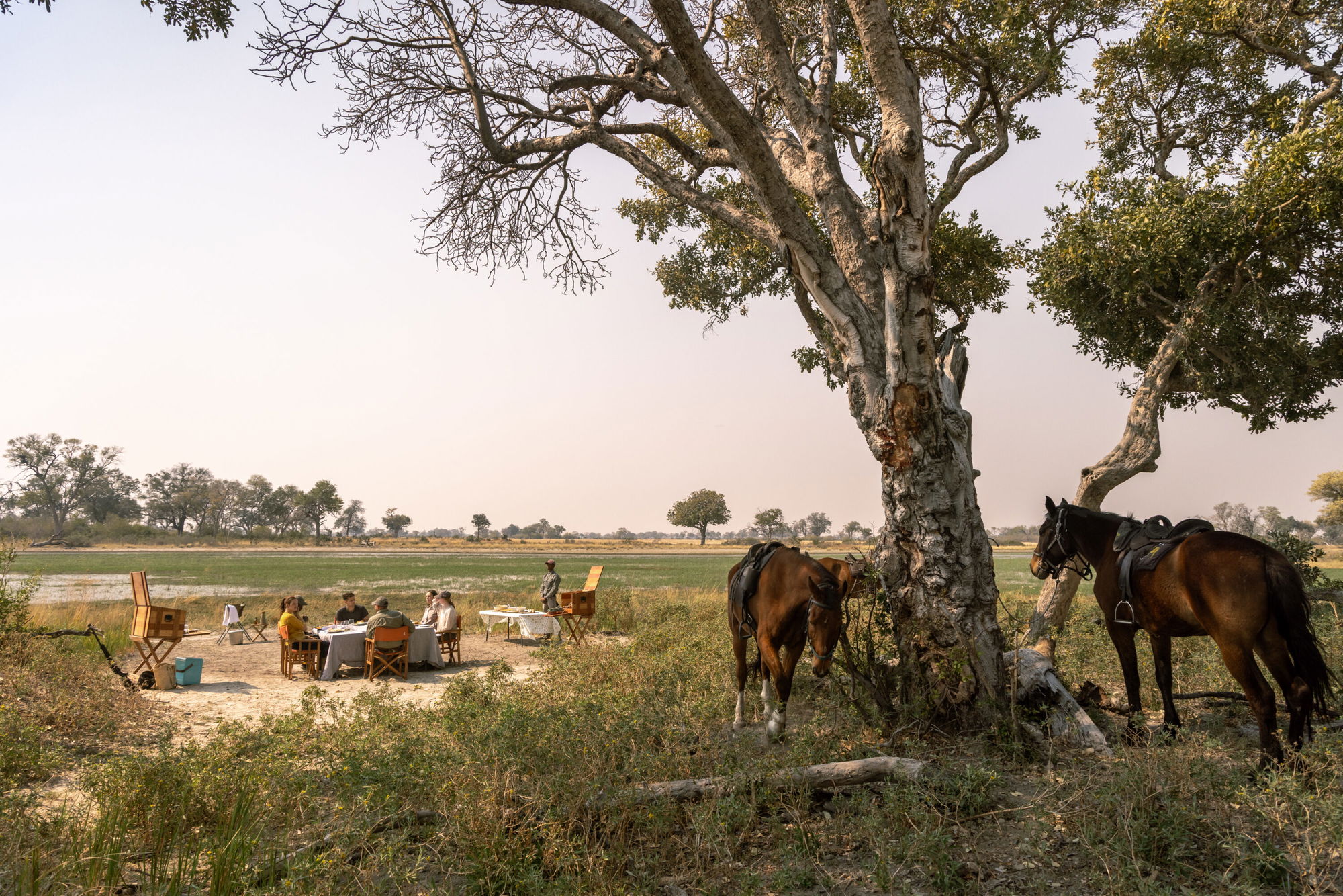 You’ll arrive at the fly-camp at sunset, greeted with a refreshing drink and sweeping views over the floodplain. Luxurious tents with proper beds, hot ensuite showers and a spacious mess tent with sofas and a small library await you. Drift off to sleep to the comforting sound of your horse munching its hay on the picket line.