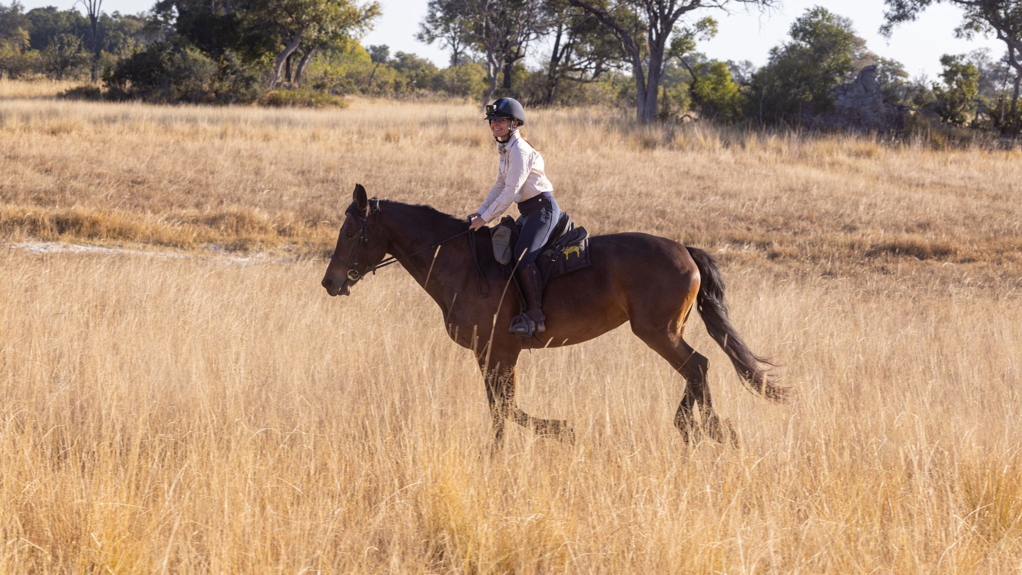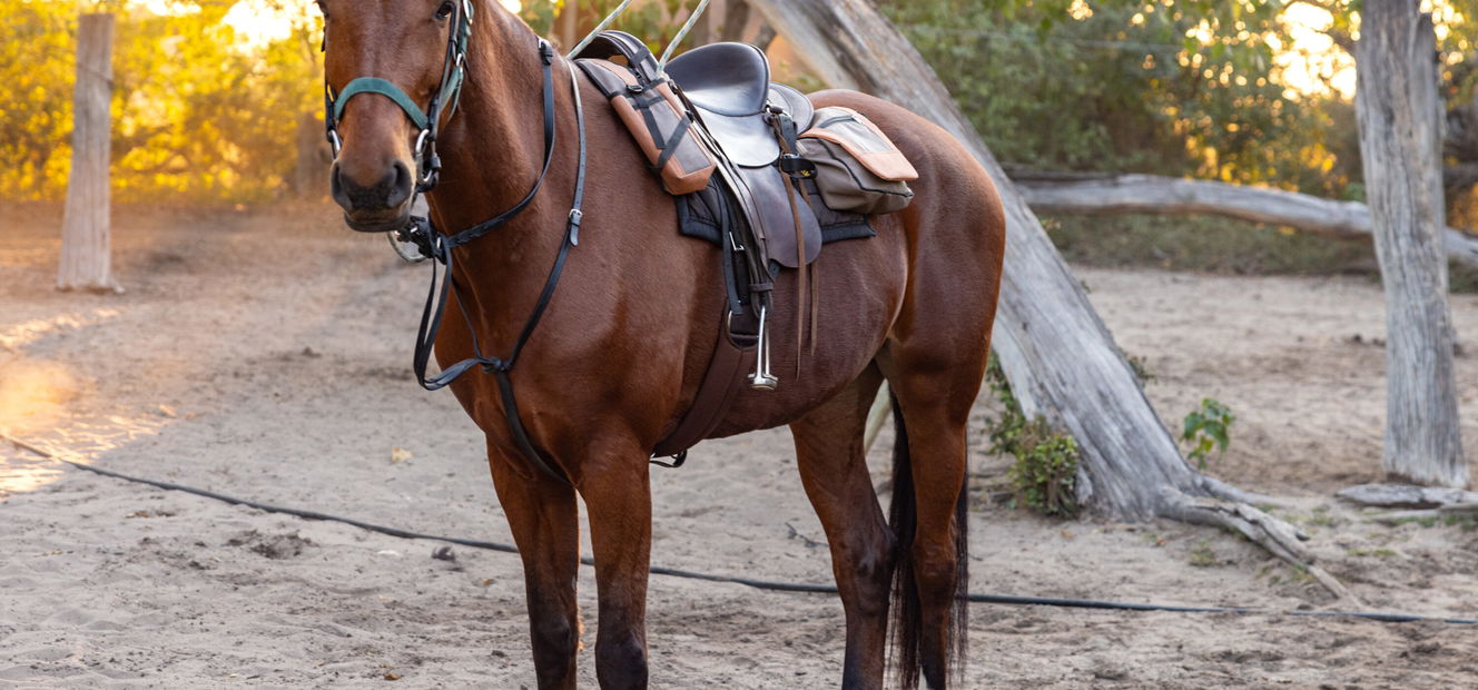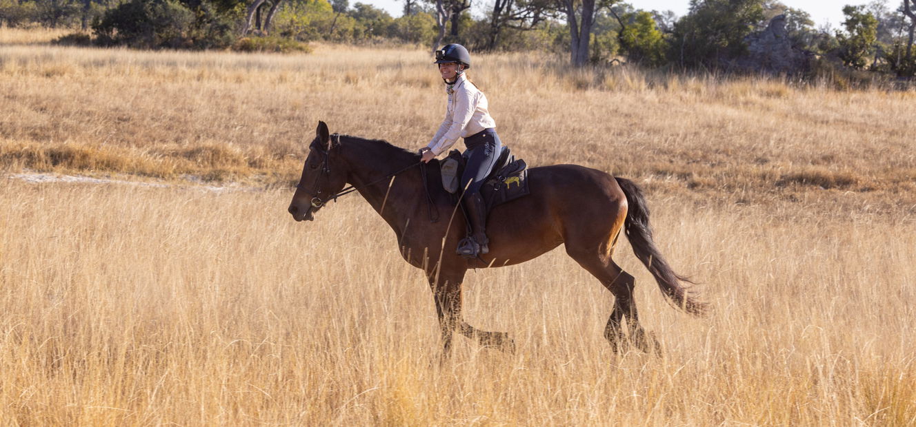 1.5 to 2 hours in the saddleYou’ll be met at Maun Airport, then whisked straight into Kujwana Camp by your chosen transfer method – a 20-minute helicopter hop, or flown by light aircraft to the nearest airstrip, followed by around an hour’s journey to camp by vehicle or boat (water permitting).