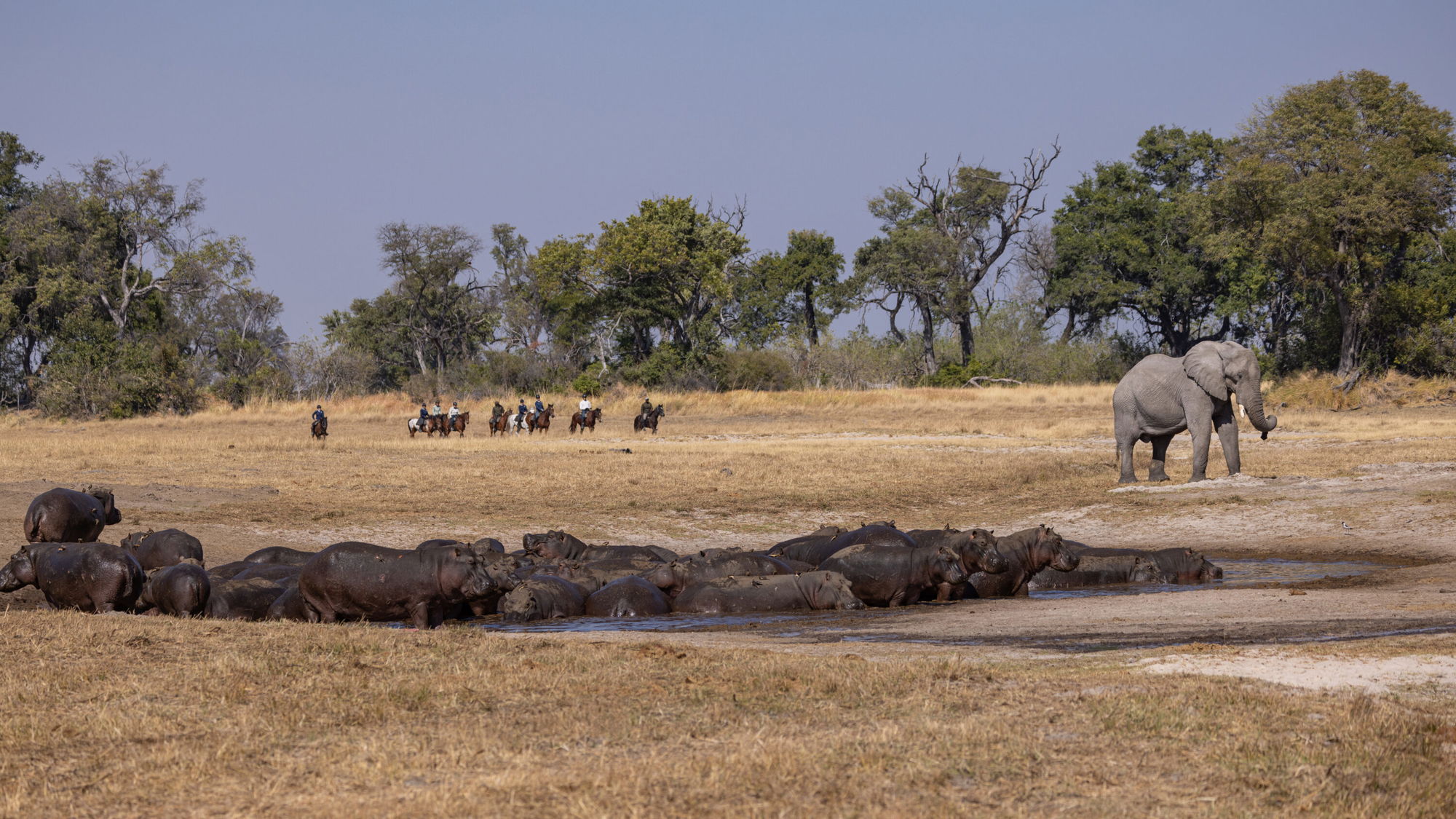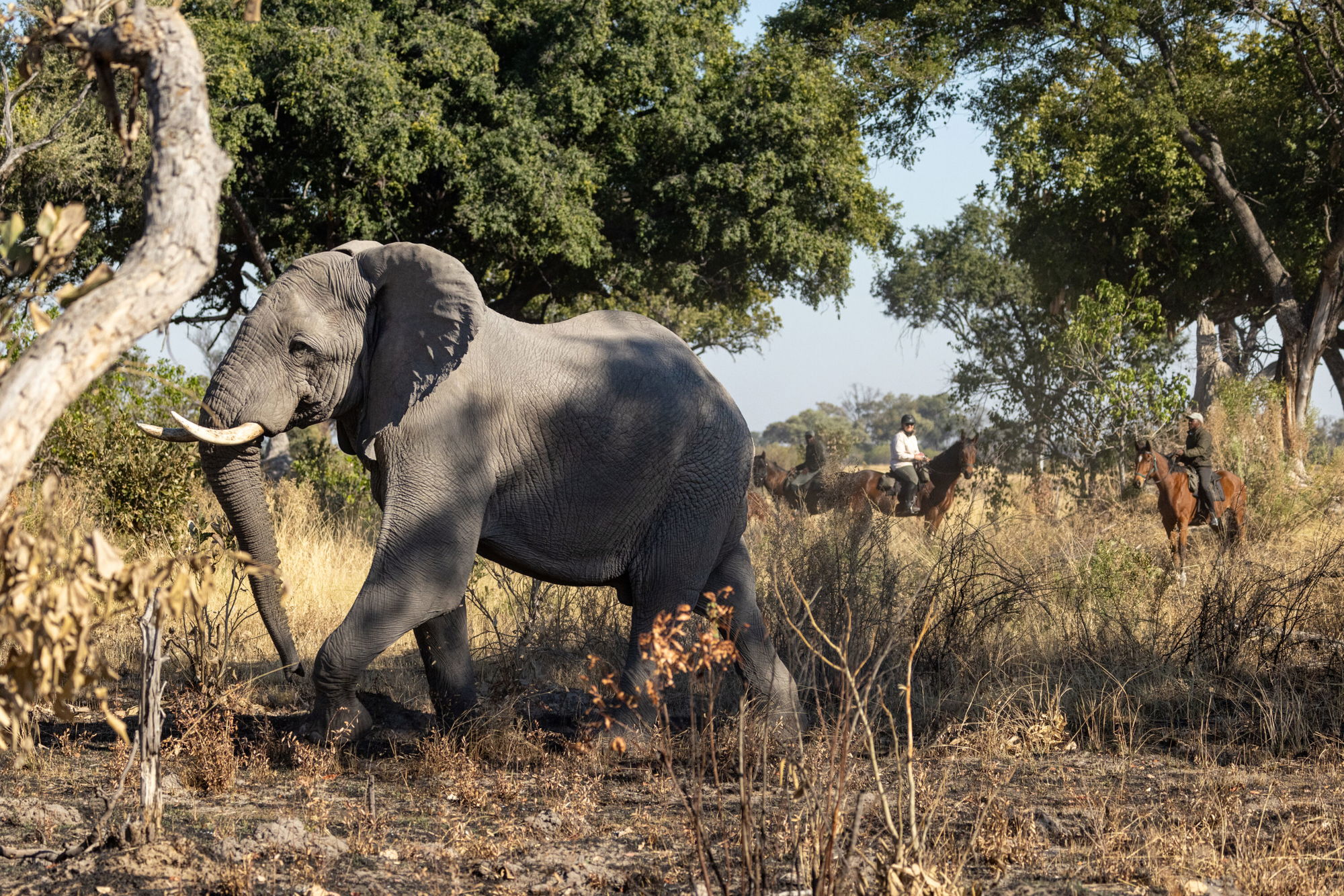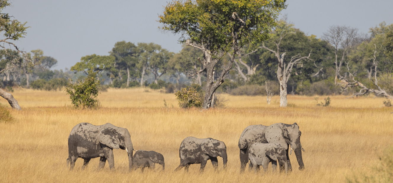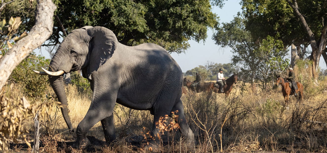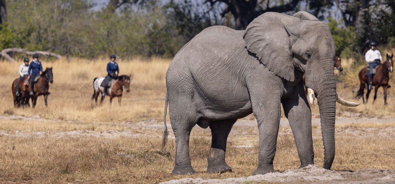 5 to 6 hours in the saddleYou’ll spend a full day riding back to Kujwana Camp, stopping for a picnic in a new spot as you complete the loop you began two days earlier. The journey leads you through a chain of rain pans – a striking contrast to the open floodplains – and then into mopane forests and acacia woodlands, where elephant, kudu and giraffe find plenty to browse. Breeding herds often shelter in the thicker forest, and if the pans are holding water, you may also encounter zebra, wildebeest and buffalo.