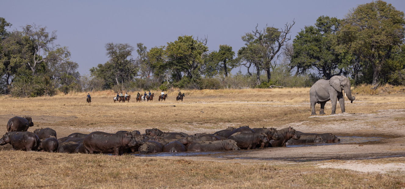 3 to 5 hours in the saddleYou’ll begin the day with a morning ride east of Kujwana Camp, weaving through shady rain pans and thick riverine forest – perfect country for tracking a breeding herd of elephants. After a snack beside a hippo-filled pool, you’ll continue into more open terrain, where you may catch sight of buffalo moving across the plains.