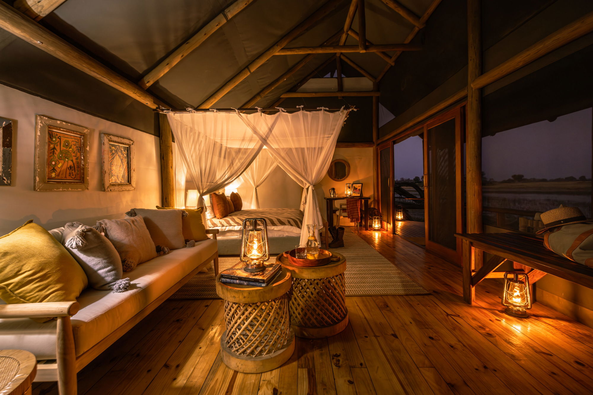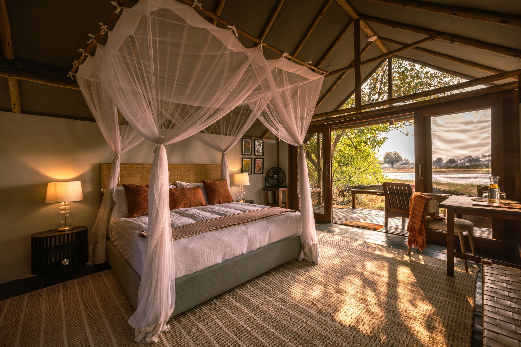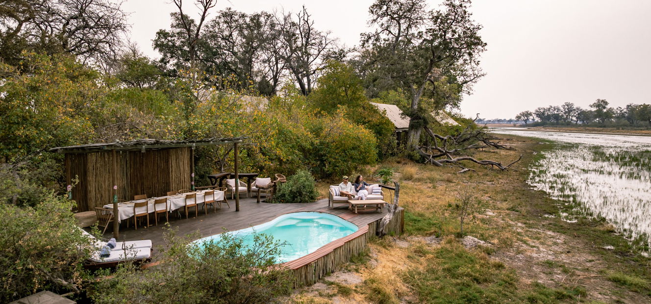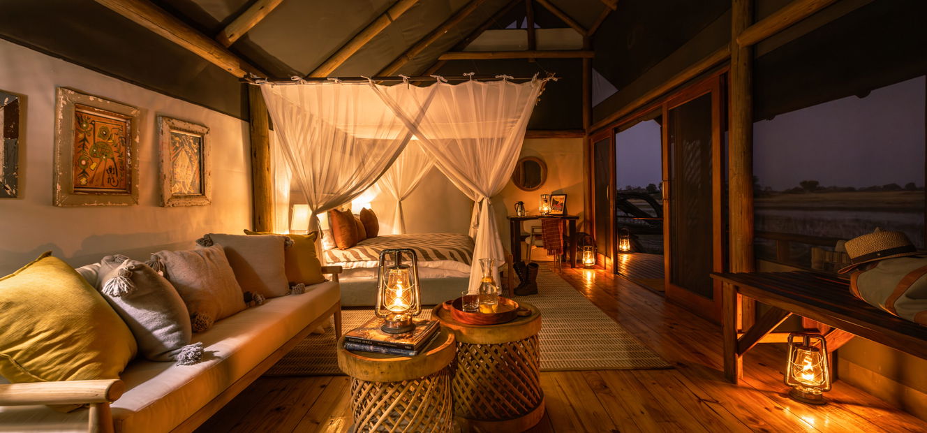 This permanent camp sits on an island in the Xudum River in the southwestern Okavango Delta, tucked into quiet woodland alive with birdsong. With just six rooms, it’s a small, exclusive camp offering a true wilderness experience with a touch of wild luxury – think vervet monkeys dropping by and elephants grazing on marula outside your tent. Each suite has a veranda overlooking the clear Delta waters, where elephants wallow and kingfishers perch in the riverine trees. At night, you’ll fall asleep to hippos grazing, and each morning the sunrise will bathe your room in warm, golden light.