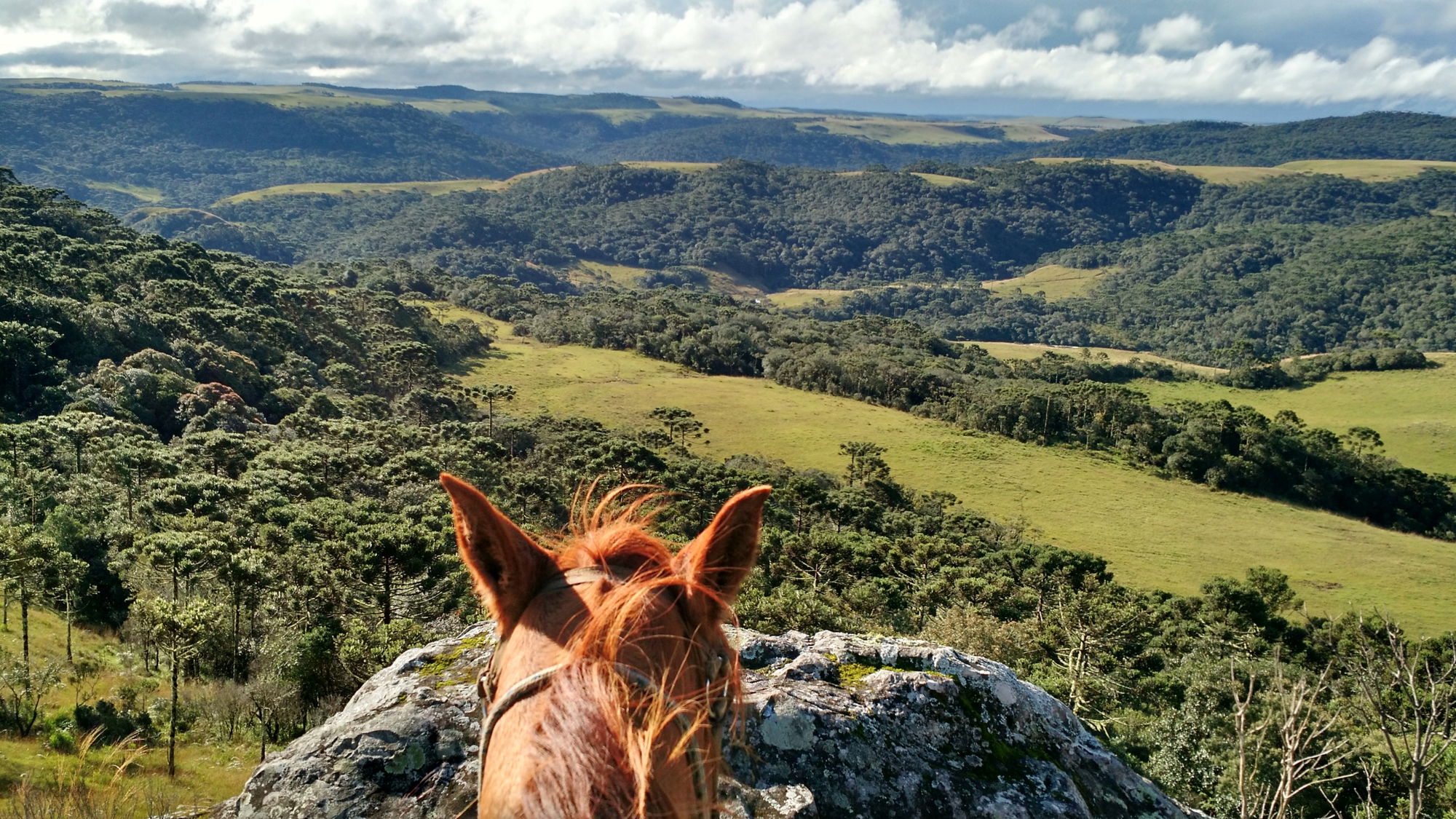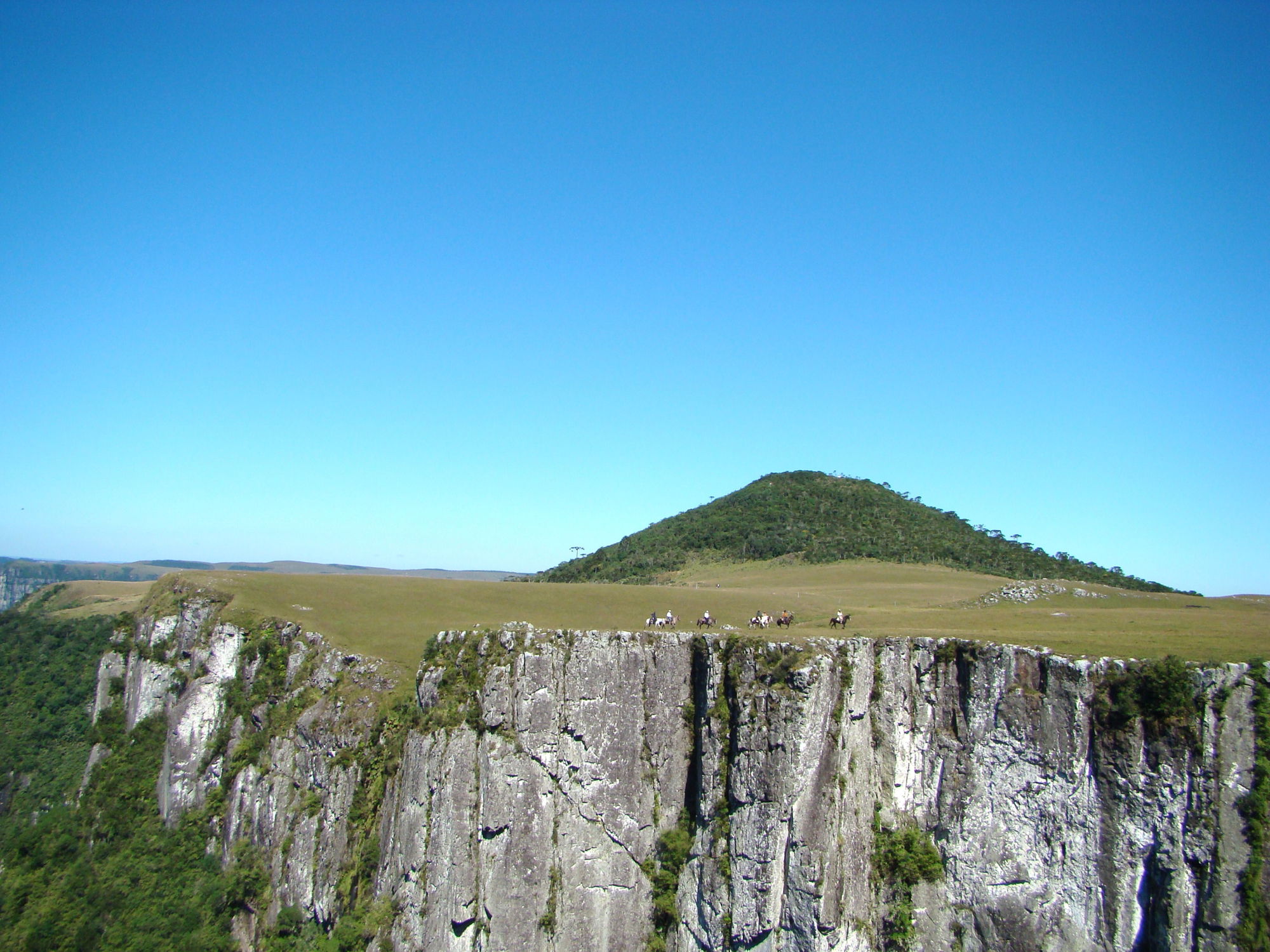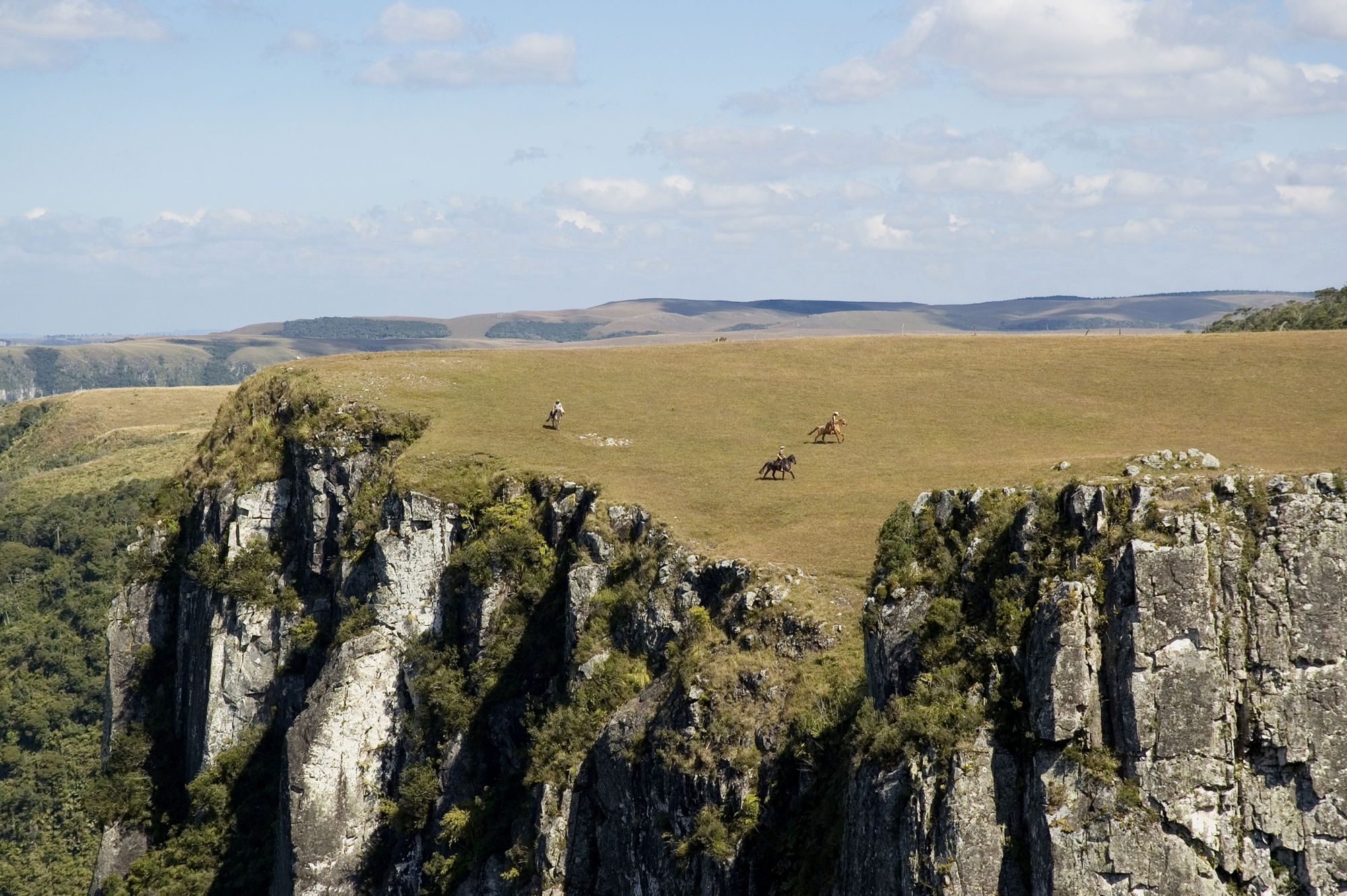 4 hours in the saddleThe ride today explores a dramatic change in scenery, moving through open fields and forest before the land suddenly drops away into vast canyons. Towering rock walls plunge up to 1,000 metres, forming a natural corridor stretching from Rio Grande do Sul towards Santa Catarina. Lunch is taken at a typical local farm before a relaxed return ride to Tio Tonho Farm.