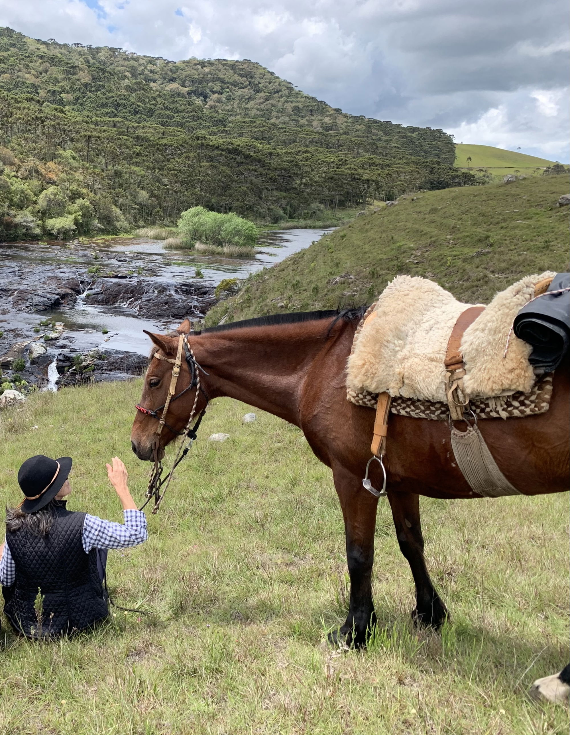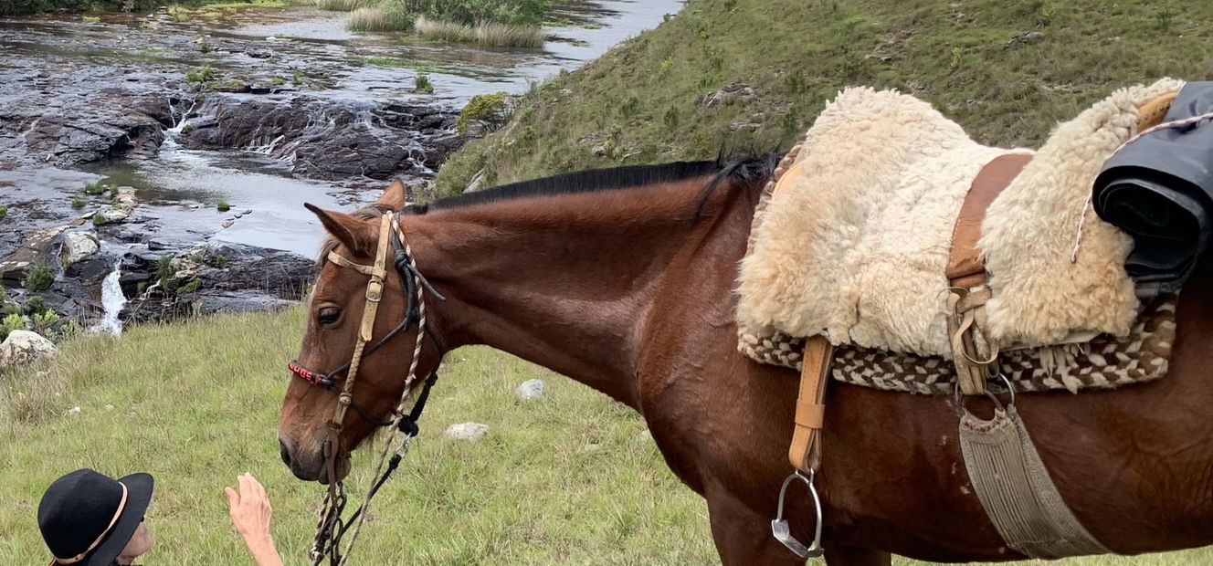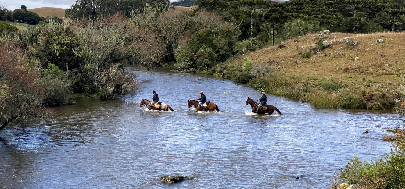 5 hours in the saddleAfter breakfast, you set off across classic coxilhas – soft, rolling hills crossed by clear rivers and shaded by ancient Araucaria trees. The route follows sections of the historic Tropeiro trail, a more than 200-year-old trading route once used to move cattle, mules and goods across southern Brazil. Lunch is enjoyed beside the river before riding on past the small village of Silveiras. The final stretch leads back to Fazenda Potreirinhos for your last night on the ride.