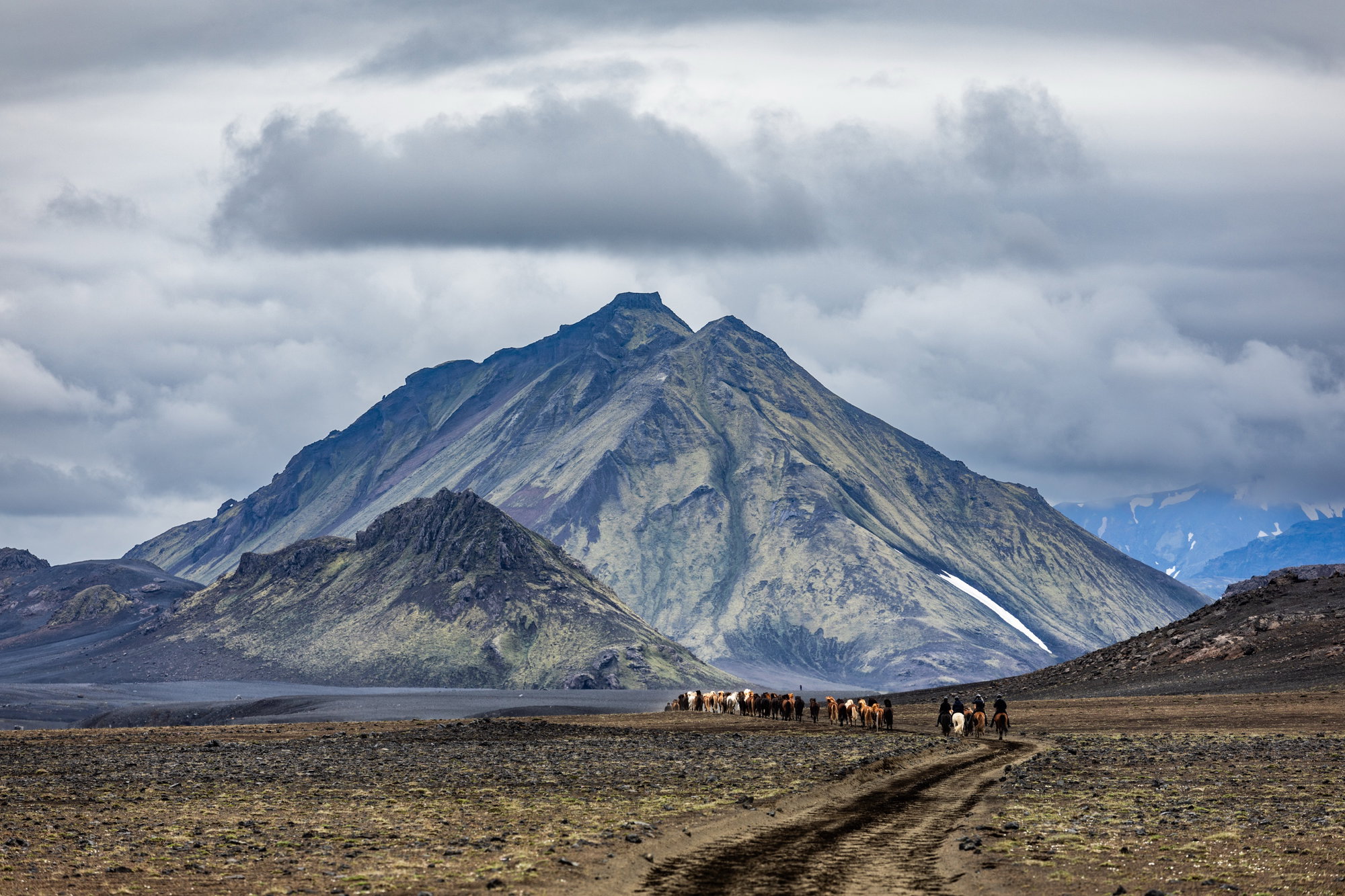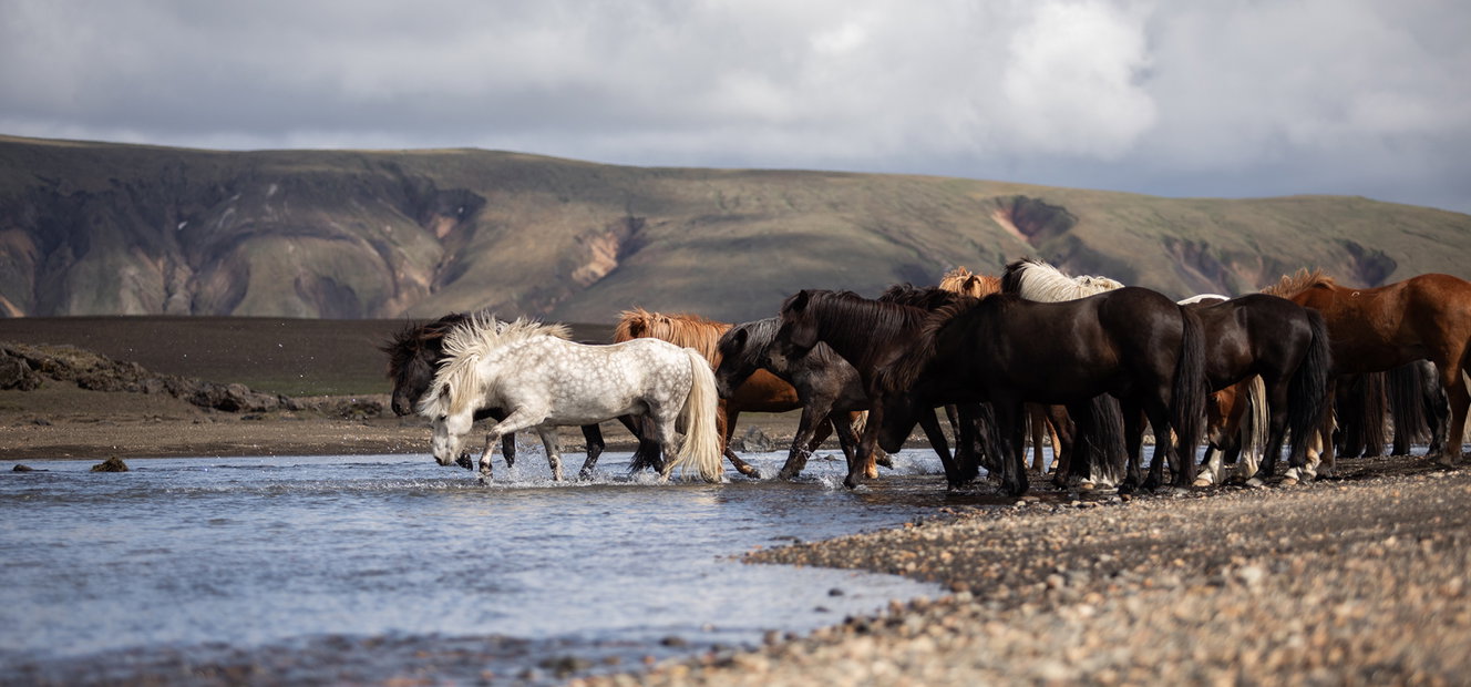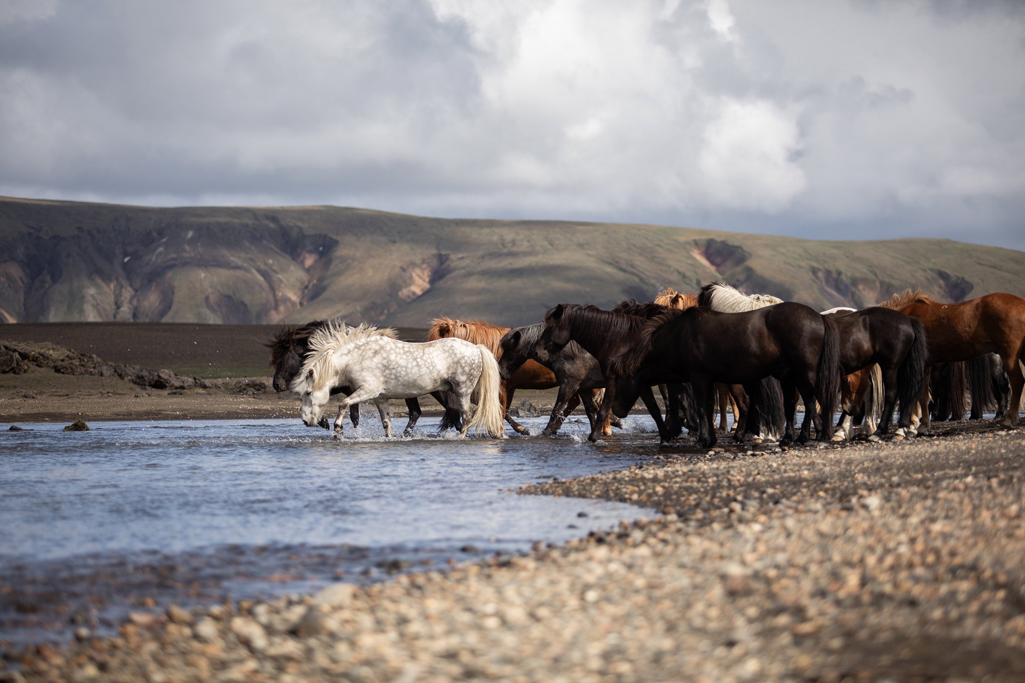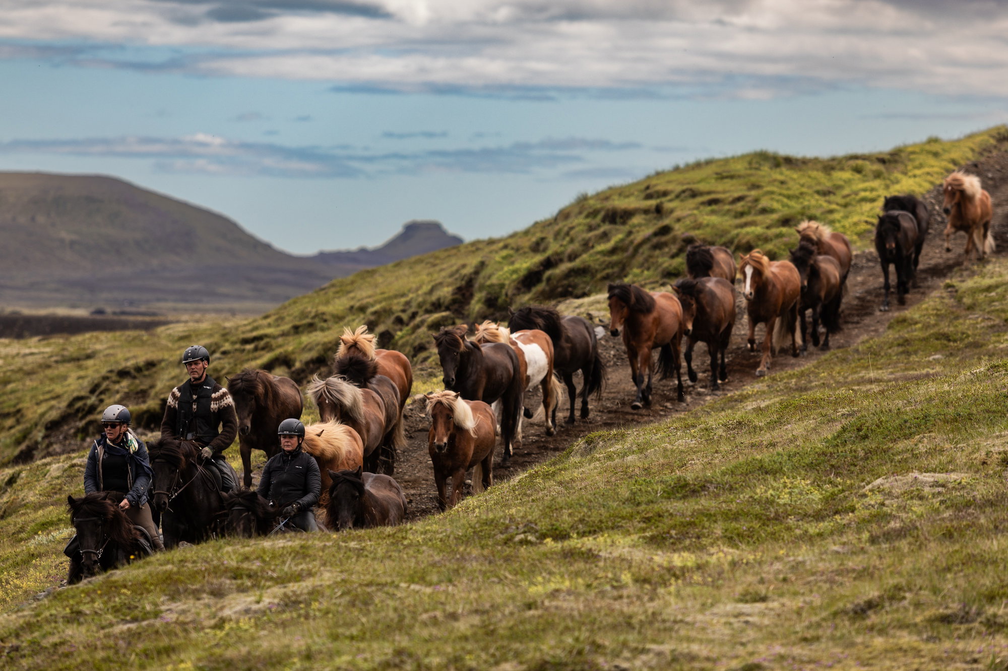 - Tölting alongside a herd of free-running Icelandic horses across lava fields, lupin valleys, rivers and vast highland wilderness