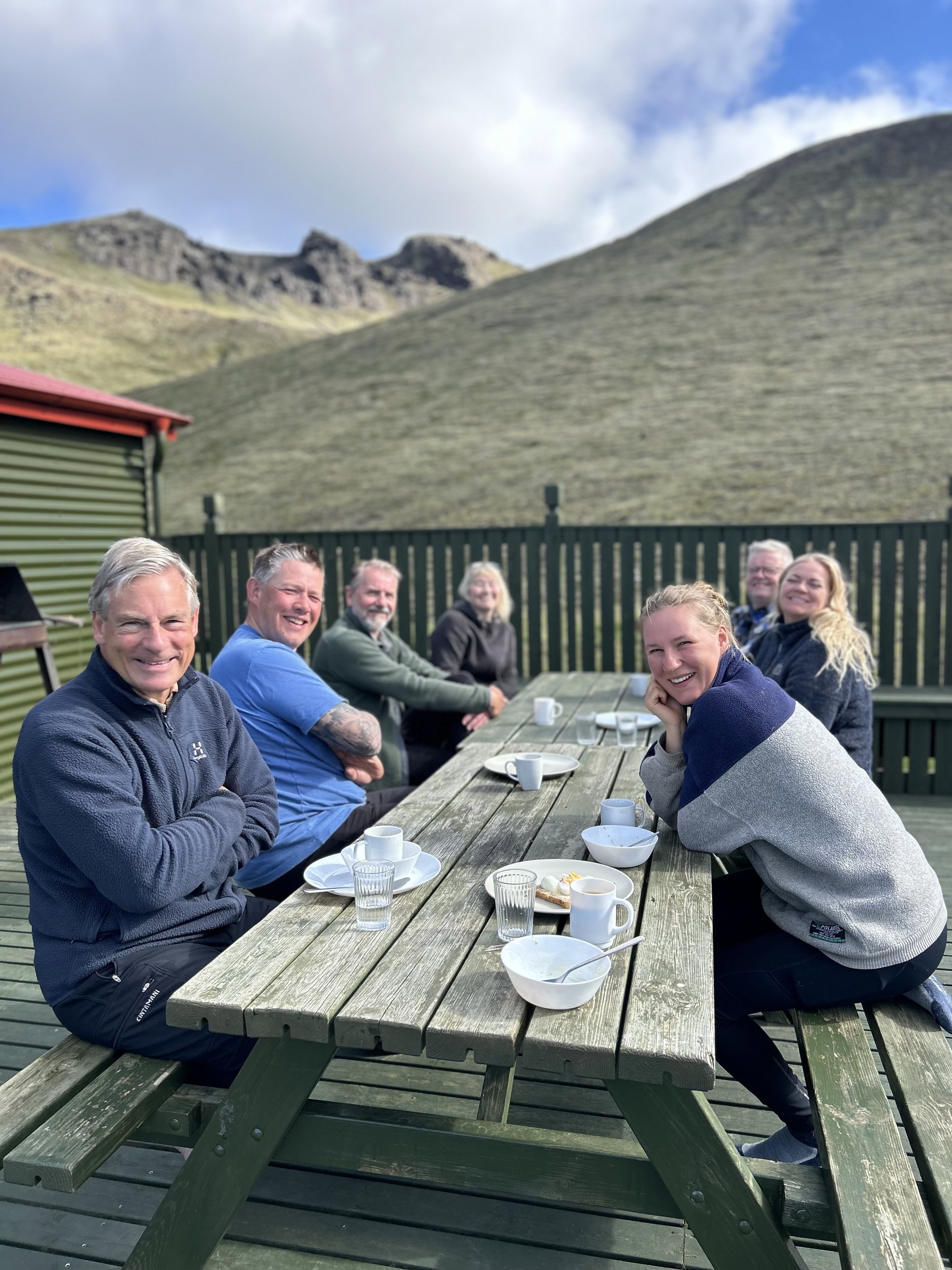 The day ends at the simplest hut of the trip in Áfangagil: partially dug into the green hillside, the hut has no electricity or showers, just sheltered rooms, a barbecue, and an outdoor table from which to absorb the secluded magic of the Icelandic highlands.