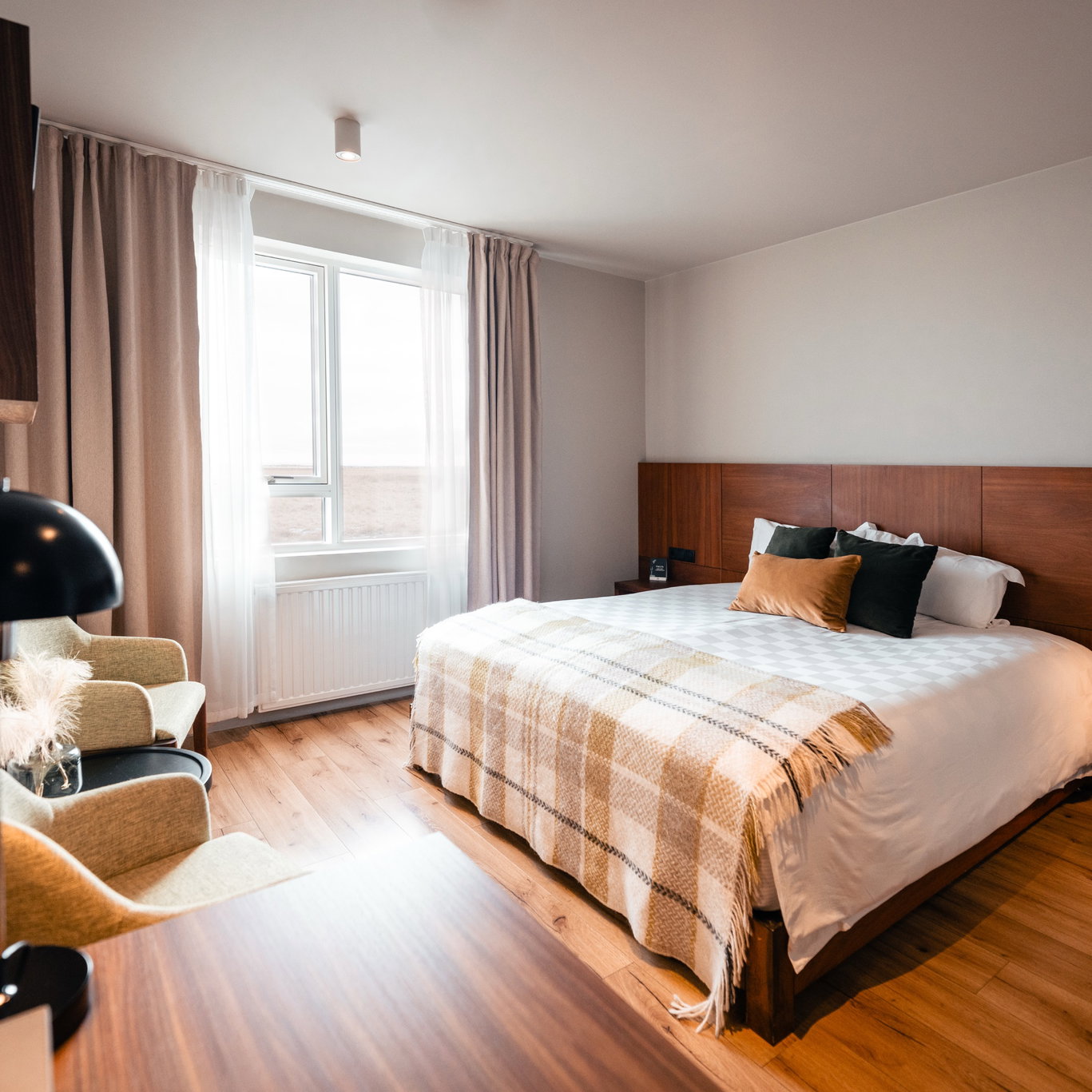 Non-riding dayToday you will be picked up from Reykjavik BSI Bus Terminal (or nearby hotels) at around 4pm, and transferred through Iceland’s striking landscapes to the beautiful, Michelin Key-awarded Umi Hotel. Prepare to marvel at this architectural masterpiece, where floor to ceiling views, modern, cosy rooms and a sauna (of course!) set the tone for a peaceful stay nestled between wild mountains and black sand beaches. You’ll dine on a thoughtfully-curated three-course dinner in the hotel’s award-winning restaurant, celebrating local flavours and fresh Icelandic ingredients – a truly memorable introduction to the adventure ahead.