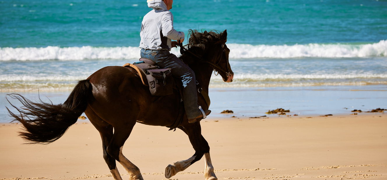5 to 6 hours in the saddleAfter a well-earned night’s rest, you’ll wake up at Henderson Bay, re-group over brekkie and do it all over again! Yep, you’ve got another day out on the west coast – more wild horses to be spotted, breathtaking scenery to be absorbed and secrets waiting to be discovered. Rest assured there is so much country on offer, you won’t ride the same trail twice. Jane will colour the ride with historical stories while pointing out native flora and fauna. In the evening you’ll return to your beachside cabins to enjoy a hearty dinner and recap the day’s highlights.