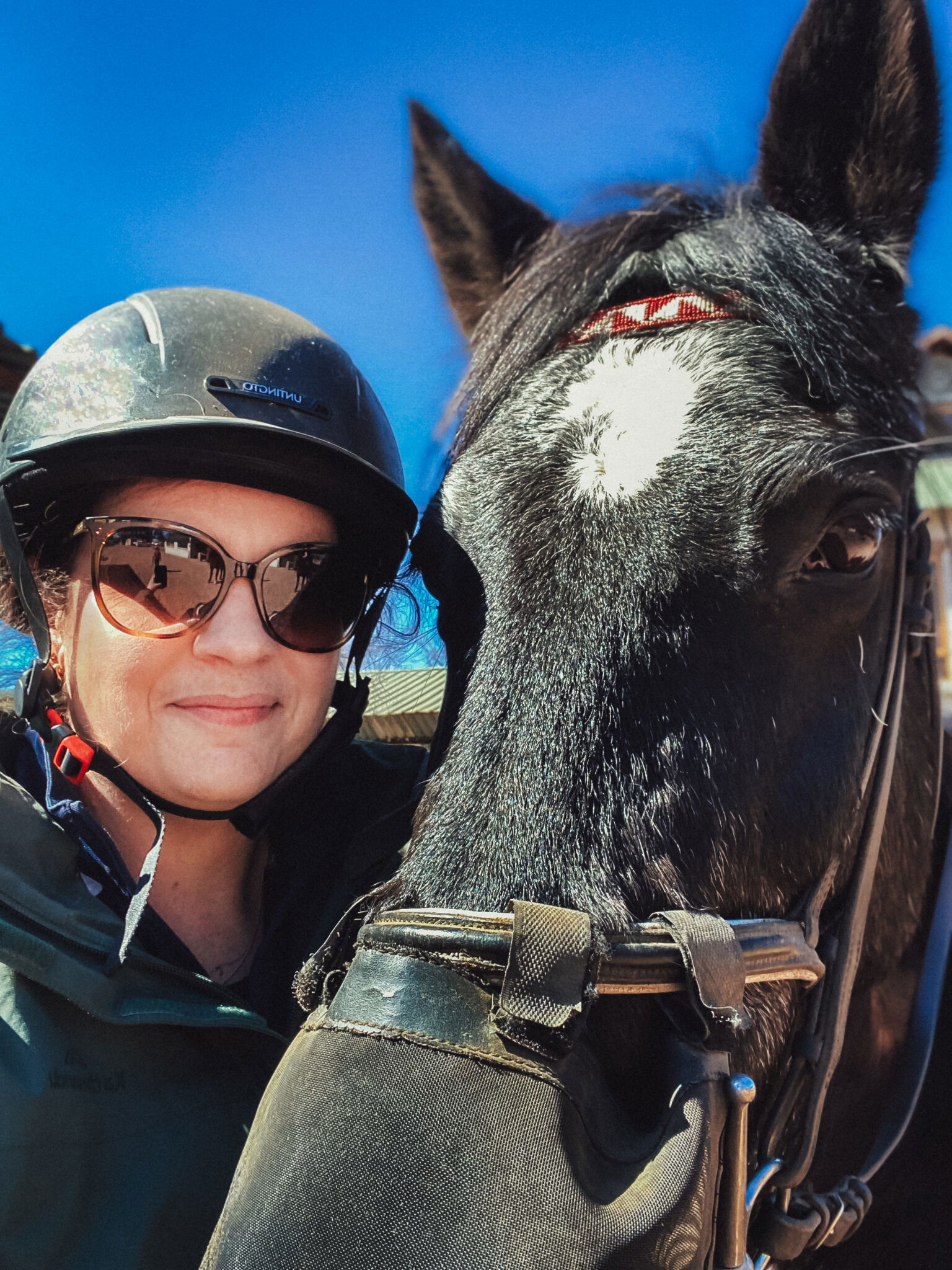 Reasonably confident riding a horse at a walk, a rising trot, and learning to canter.