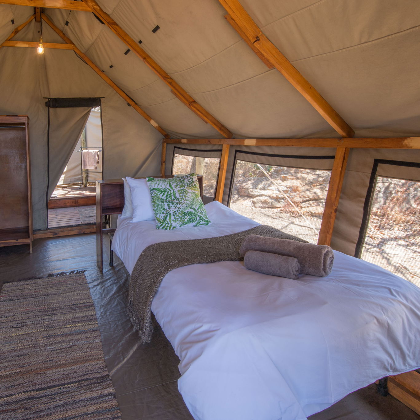 African Explorer: 3 nights at Camp Davidson, where luxurious, beautifully appointed, spacious canvas tents sit nestled amongst sandstone ridges overlooking grassy, game-filled valleys. Each tent has an ensuite, and there is a pool, too.