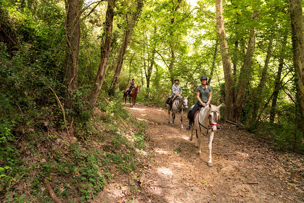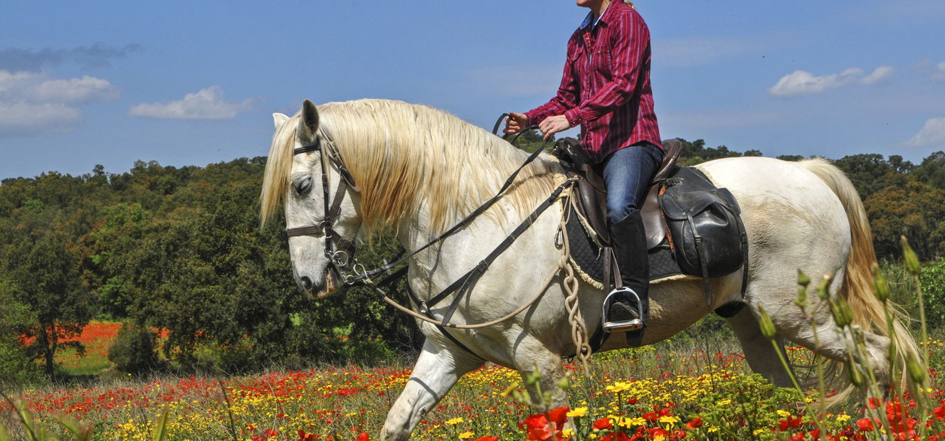 With a full belly and a warm flush in your cheeks, you’ll mount up and trot along stone terraces that were laboriously constructed, stone by stone, in ancient times. Gnarled old olive trees line the path, and there are plenty of smooth stretches where you can savour your Andalusian’s smooth, spirited canter. You’re approaching the floodplains of Orlina, where wildflowers bloom abundantly amidst age-old, mysterious rounded rock formations and weather-beaten Celtic tombs. As you cross the lowlands of the Ampurdán, you’ll be able to see the lay of the land, which resembles an amphitheatre enclosed by the mountains, spilling out into the far-away Gulf of Roses.