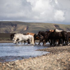 • Tölting alongside a herd of free-running Icelandic horses across lava fields, lupin valleys, rivers and vast highland wilderness