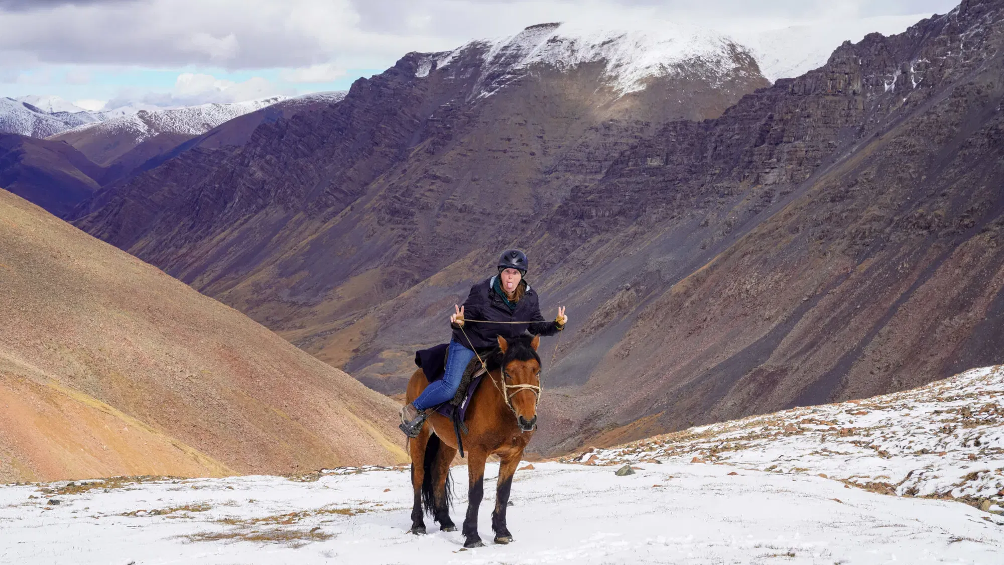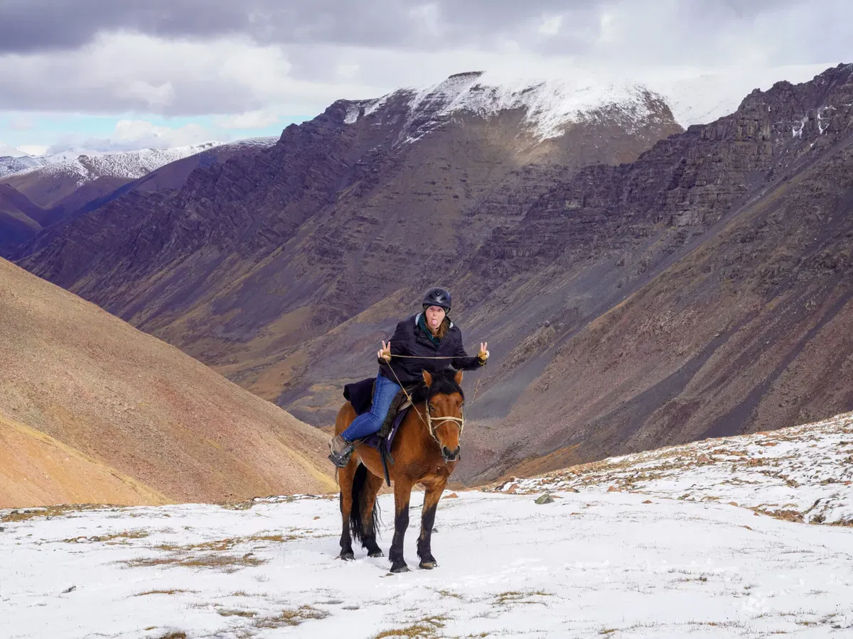 I love the sudden drama of snow-capped mountain ranges, entirely cloaked in blinding white powder. I love the crunch under foot, the soft indentations of hooves, splitting thin ice shards that too quickly melt in the shallow grooves of flat brown boulders, becoming a precious water source for all creatures. I love the way the horses wend their way through the drift, scooping frozen mouthfuls as they go, only to bob up with icicle whiskers and ticklish nostrils. I love the jagged and arduous climb of mountain passes, the frosty silver, the heavy wetness that shrouds you. I love squinting into the burning sun while your eyelashes catch tiny snowflakes, and your still-warm breath fogs up your sunglasses. I love the sideways pelt of frosty missiles as you step straight into a blizzard. I love the nothingness of a complete whiteout. I love the unsettling and biting winds that flay you as you go.